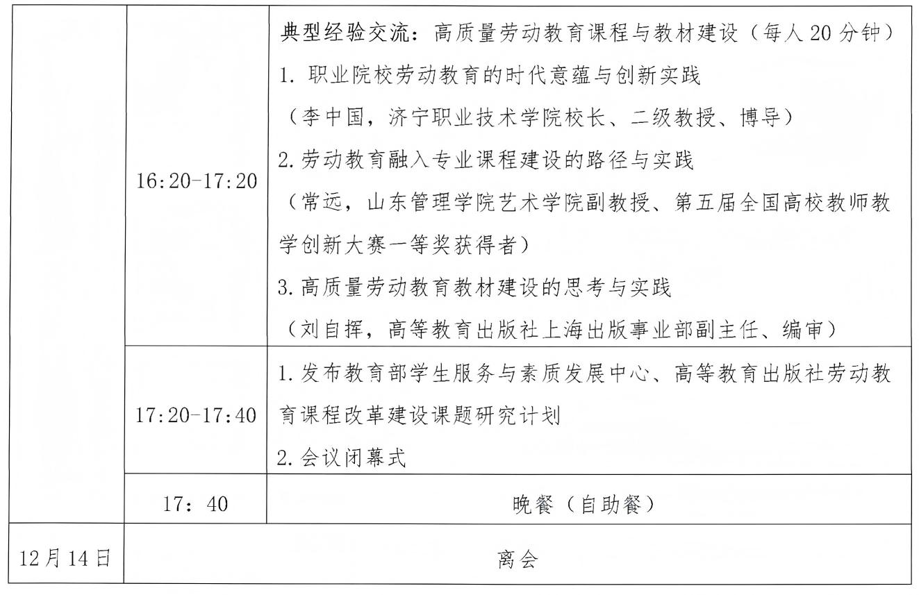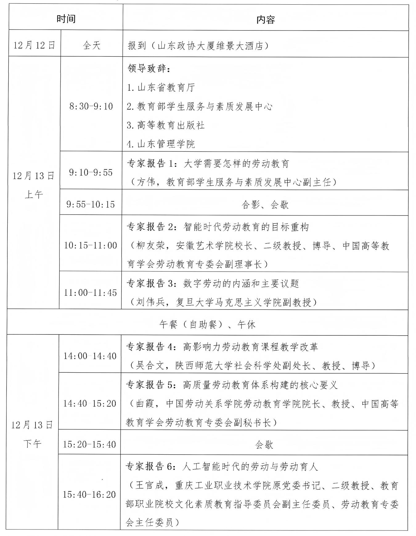 为深入贯彻党的二十届四中全会精神、全国教育大会精神和习近平总书记关于教育的重要论述,贯彻落实《教育强国建设规划纲要(2024—2035年)》《中共中央 国务院关于全面加强新时代大中小学劳动教育的意见》精神和教育部相关文件要求,健全德智体美劳全面培养体系,加快补齐劳动教育短板,推进新时代高校劳动教育课程改革与建设,教育部学生服务与素质发展中心和高等教育出版社兹定于2025年12月12-14日在山东济南举办“新时代高校劳动教育课程改革与建设经验研讨会”,我校将承办本次会议。现将有关事项通知如下: