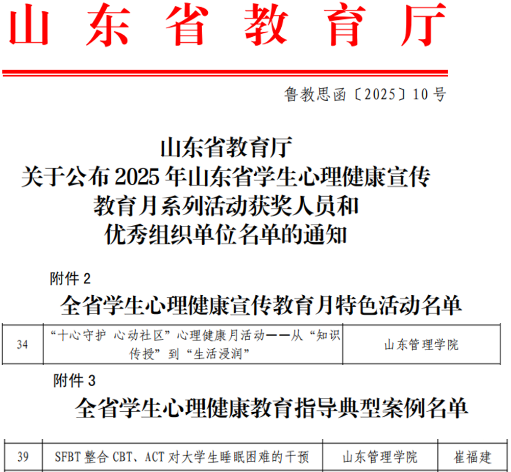 在山东省教育厅等4部门关于2025年山东省学生心理健康宣传教育月评选活动中,我校提交的《“十心守护 心动社区”心理健康月活动——从“知识传授”到“生活浸润”》获评全省学生心理健康宣传教育月特色活动;《SFBT整合CBT、ACT对大学生睡眠困难的干预》获评全省学生心理健康教育指导典型案例。