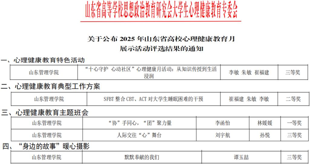 在山东省高校思想政治教育研究会大学生心理健康教育专委会组织的2025年山东省高校心理健康教育月评选中,我校获一等奖一项、二等奖一项、三等奖三项。