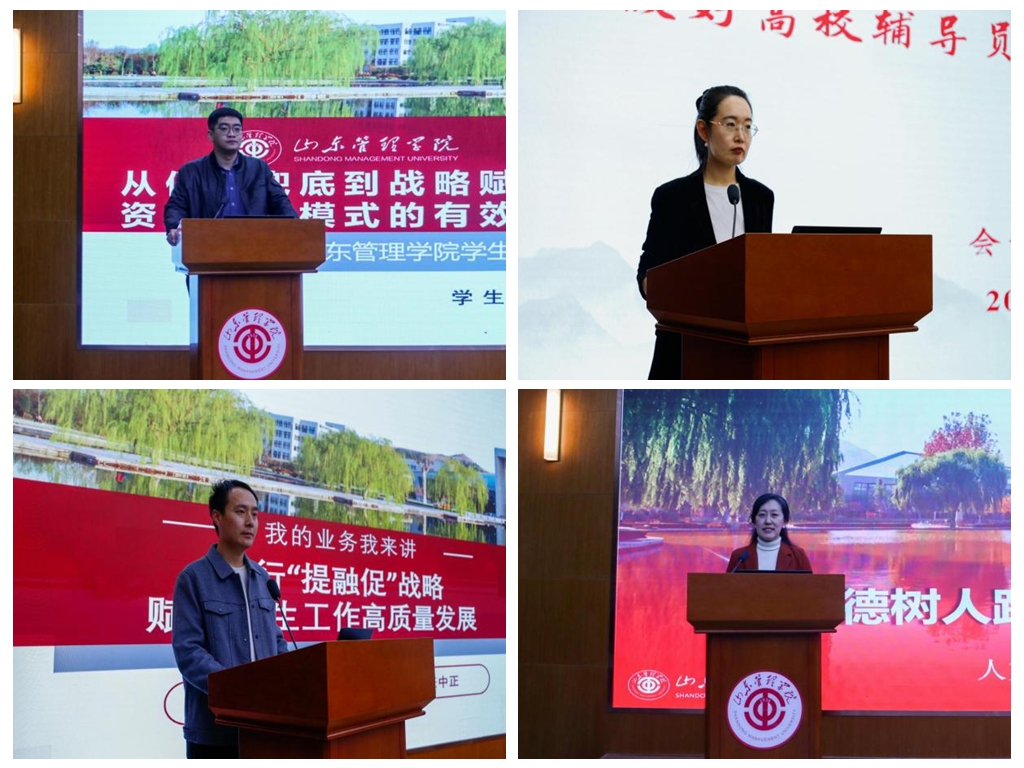 在展示环节中,4位负责学生工作的教师代表分别从“1234X”资助育人模式,辅导员日常工作内容、思路与方法,如何将“提融促”战略融入日常工作、“一个中心、三个融入”的学生工作模式等方面进行了分享。