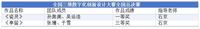 近日,第18届全国三维数字化创新设计大赛全国总决赛比赛结果揭晓,我校人文学院学生作品脱颖而出,共获奖项15项。其中,国赛一等奖1项、三等奖1项。此次成绩刷新我校在该项赛事中的历史最佳成绩。