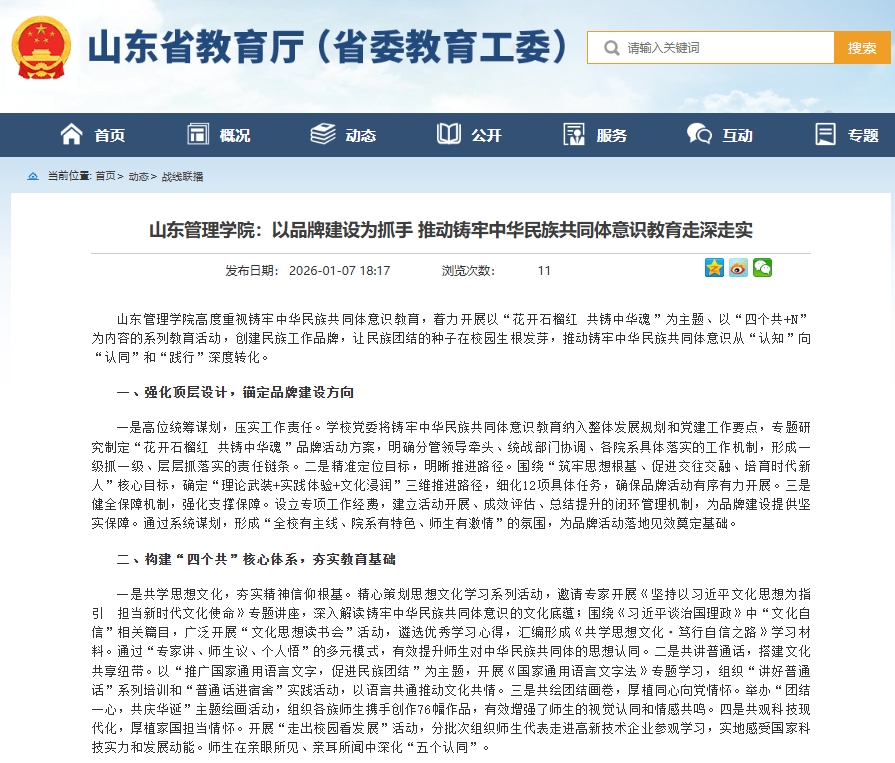 1月7日,山东省教育厅(省委教育工委)以《山东管理学院:以品牌建设为抓手 推动铸牢中华民族共同体意识教育走深走实》为题,报道我校高度重视铸牢中华民族共同体意识教育,着力开展以“花开石榴红 共铸中华魂”为主题、以“四个共+N”为内容的系列教育活动,创建民族工作品牌,让民族团结的种子在校园生根发芽,推动铸牢中华民族共同体意识从“认知”向“认同”和“践行”深度转化的经验做法。