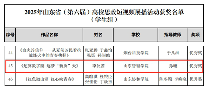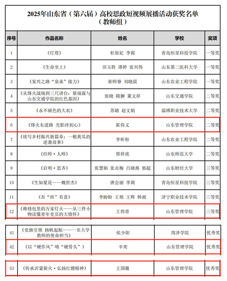 近日,由省委宣传部指导,大众报业集团(大众日报社)、山东省广播电视局共同主办的2025年山东省(第六届)高校思政短视频展播活动获奖结果公布,我校报送的短视频作品荣获教师组二等奖1项、三等奖1项、优秀奖2项,学生组优秀奖1项。