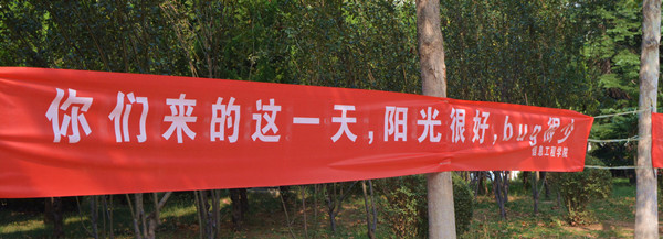 校门口伫立着巨大的迎新生彩虹桥,学校各主干道也挂起了一条条迎新标语条幅,校园里呈现出一派迎新的喜气。