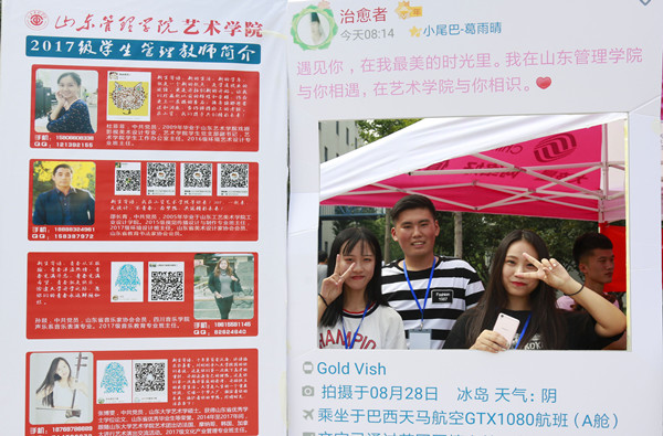 新生报到处人头攒动,各学院为了入学第一天给新生留下美好回忆,纷纷各出奇招:党员亮身份、签名墙、致一年后自己的一封信、放大版朋友圈,丰富多样的迎新方式给新生及家长留下了深刻印象。