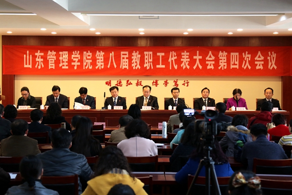 表决通过了《山东管理学院第八届教职工代表大会第四次会议决议》。大会号召,全体代表和全校教职员工要在学校党委的领导下,深入学习贯彻党的十八大和十八届三中、四中、五中全会精神以及习近平总书记系列重要讲话精神,坚持“创新、协调、绿色、开放、共享”发展理念,落实立德树人根本任务,以培养高素质应用型人才为目标,坚持问题导向,围绕做好顶层设计、夯实发展基础、凝练发展特色、提升办学效益、做强发展优势、保障和改善民生等工作,深化综合改革,强化规范管理,创新工作机制,凝聚发展合力,努力推动“十三五”开局之年的各项工作再上新台阶,为早日把我校建设成特色鲜明的高水平应用型大学、开创学校事业新局面而努力奋斗。