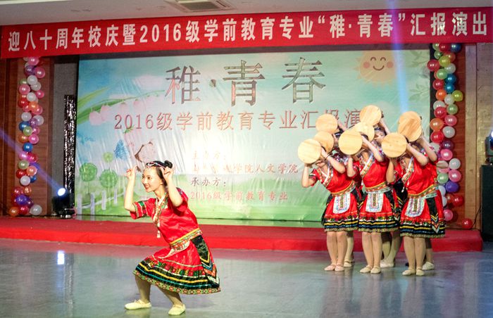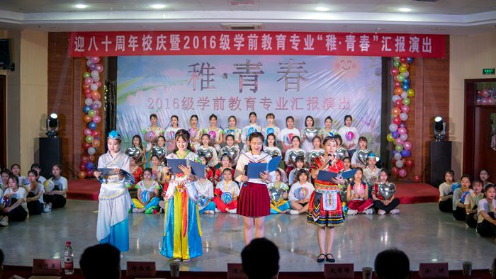 5月16日晚,迎八十周年校庆暨2016级学前教育专业“稚∙青春”汇报演出在图书馆报告厅举办。党委书记冯庆禄、副院长杨西国,办公室、工会、教务处、艺术学院、人文学院主要负责人,长清区童善儿童关爱中心主任李晓,以及人文学院师生共同观看了此次汇演。