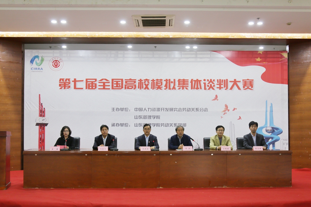 10月13日上午,由中国人力资源开发研究会劳动关系分会、山东管理学院主办的第七届全国高校模拟集体谈判大赛在山东管理学院拉开序幕。中华全国总工会权益保障部副部长王晓华,中国企业联合会雇主工作部主任张文涛,人力资源和社会保障部劳动关系司调研员付楠楠,中国人力资源开发研究会劳动关系分会名誉会长常凯、会长冯喜良、副会长李坤刚,山东管理学院院长邹广德、纪委书记房克乐,以及山东省协调劳动关系三方会议成员单位相关领导、山东管理学院有关部门负责人出席开幕式。来自全国各地34所高校和本届大赛的特邀嘉宾、评委参加开幕式。开幕式由房克乐主持。