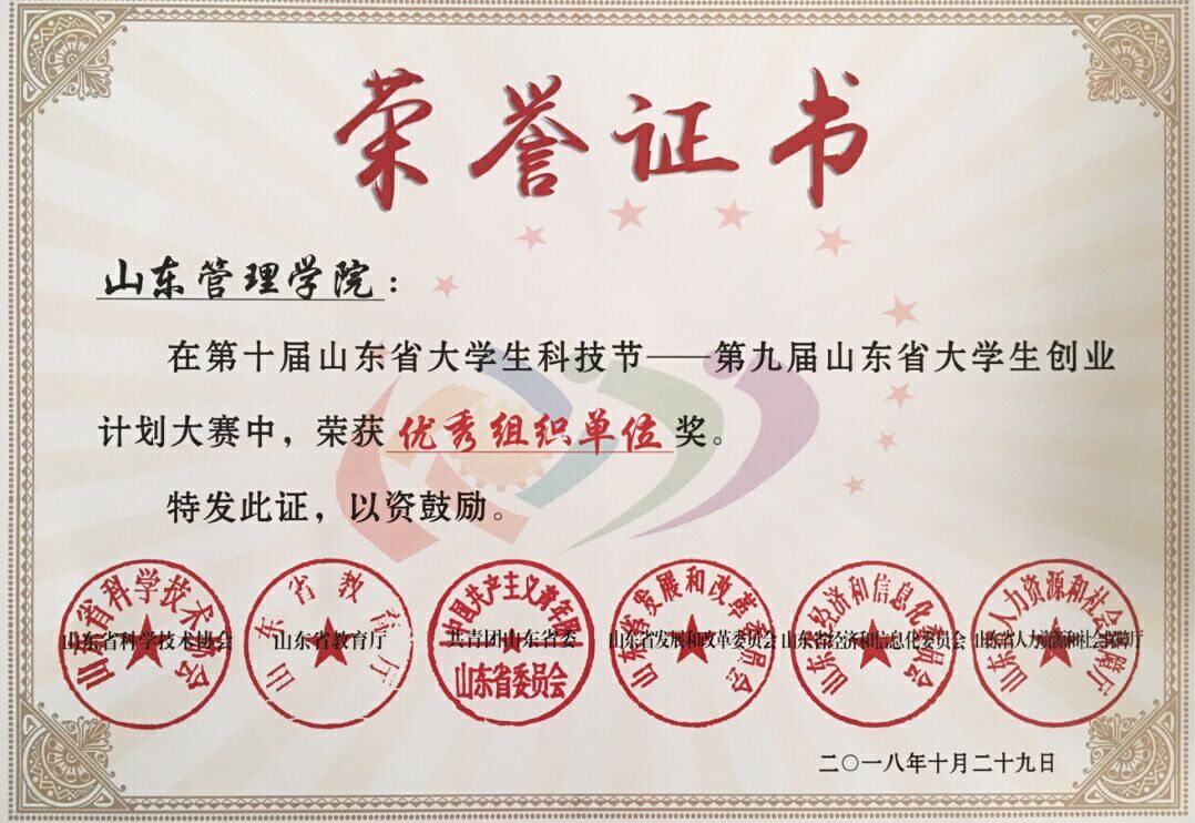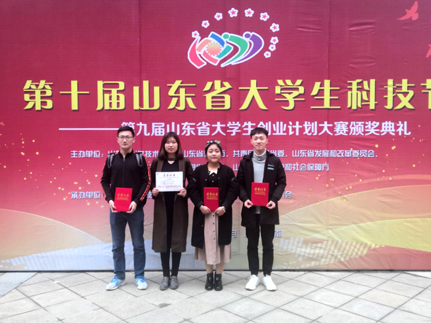 近日,第九届山东省大学生创业计划大赛颁奖典礼在山东大学举行。本项赛事由山东科学技术协会、山东省教育厅、共青团山东省委、山东省发展和改革委员会、山东省经济和信息化委员会、山东省人力资源和社会保障厅等联合主办,山东大学、山东师范大学、曲阜师范大学、山东科技大学、山东管理学院等40所高校参加了本届比赛。我校学生参赛并取得优异成绩,一举囊括了一二三等奖。