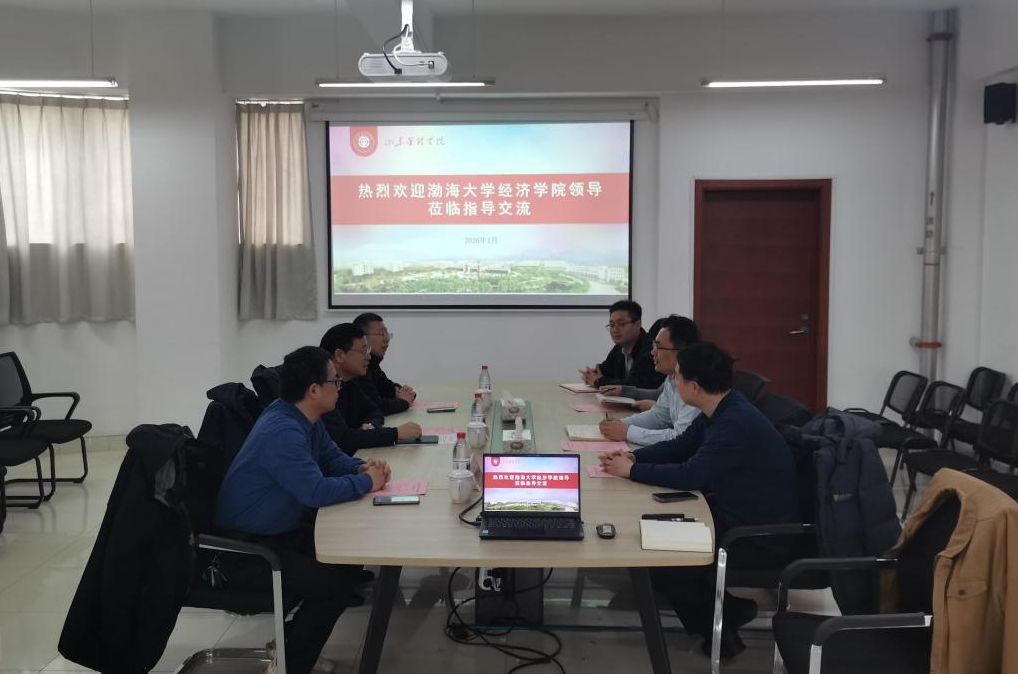 为进一步加强硕士点建设,推进我校与渤海大学签署的战略合作协议落实落地,1月28日下午,渤海大学经济学院院长张满林、副院长苏明政一行应邀来访我校,就数字经济硕士学位授权点申报工作展开交流研讨。学校科研处处长、经贸学院院长杨成宝,经贸学院副院长朱庄瑞及金融工程专业部分教师参加座谈。