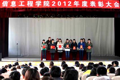 曲院长宣读了《信息工程学院关于表彰2011-2012学年优秀团干部、优秀团员的决定》、《信息工程学院关于表彰2011-2012学年省级以上参赛获奖者、奖学金获得者、优秀学生干部、优秀学生和先进班集体的决定》,院领导和华恒兴张总为获奖个人和先进集体的代表颁发了奖状和荣誉证书。