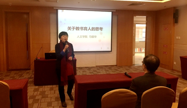 马银华首先提出“一堂优质的课应该包括哪些要素”这一问题,引发老师们思考。从而得出一堂优质的课应包括两个要素:课堂内容和培养学生品德,由此引出沙龙“教书育人”的主题。马银华从“为什么教书育人”和“如何教书育人”两个问题展开,结合古今伟大的教育家,向大家阐释了教书育人是时代赋予的历史使命,是教育的应有之义。她说,老师们应立德修身,加强个人师德修养;善于挖掘学科专业中所蕴含的思想教育价值;在日常教学过程中自觉树立育人的意识。
