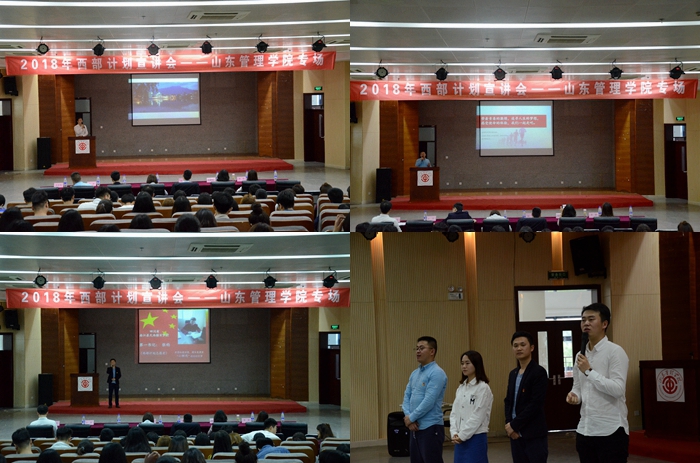 5月21日,2018西部计划四川专项宣讲团团长、共青团四川省委志工部部长杨杰带领5名西部计划优秀志愿者来到我校,在图书馆报告厅为我校师生作了一场生动的西部计划项目宣讲会。山东省志愿者行动指导中心活动部部长、团省委志工部刘杰,学生工作处副处长、团委副书记商漱莹及来自全校各学院300余名师生代表参加了宣讲会。