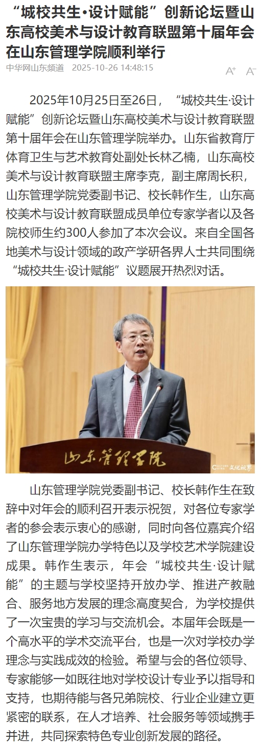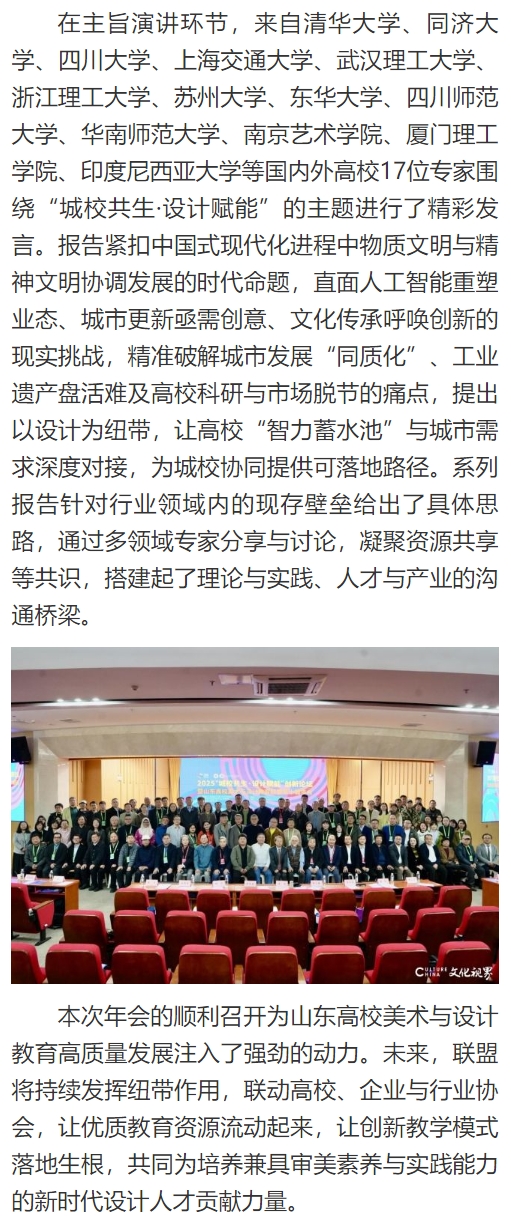 下一条:【鲁网】“城校共生·设计赋能”创新论坛暨山东高校美术与设计教育联盟第十届年会举行