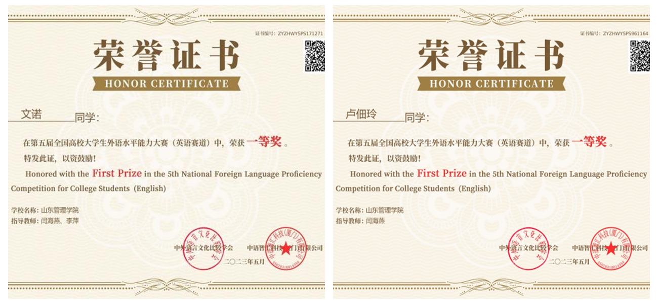 由中外语言文化比较学会主办的全国高校大学生外语水平能力大赛,旨在推动外语教学测试数字化改革创新,落实“以赛促教、以赛促学、以赛促练”的教学指导思想。本次大赛吸引了全国270余所高校的5万余名学生报名参赛。经过激烈的初赛、复赛角逐,我校2021级商务英语专业学生张桂芳、陈雨露以优异成绩获得特等奖,2021级商务英语专业学生文诺、卢佃玲获得一等奖,为我校学生历年来在该项赛事上取得的最好成绩。